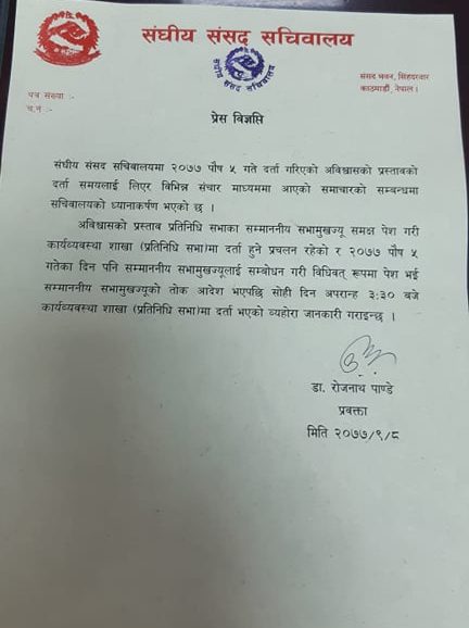 प्रस्ताव दर्ता भएको समयबारे फरक फरक कुरा बाहिर ल्याएको संघीय संसद सचिवालयले पूनः आज उक्त प्रस्ताव पुस ५ गते अपरान्ह साढे ३ बजे दर्ता भएको स्पष्ट पारेको हो।